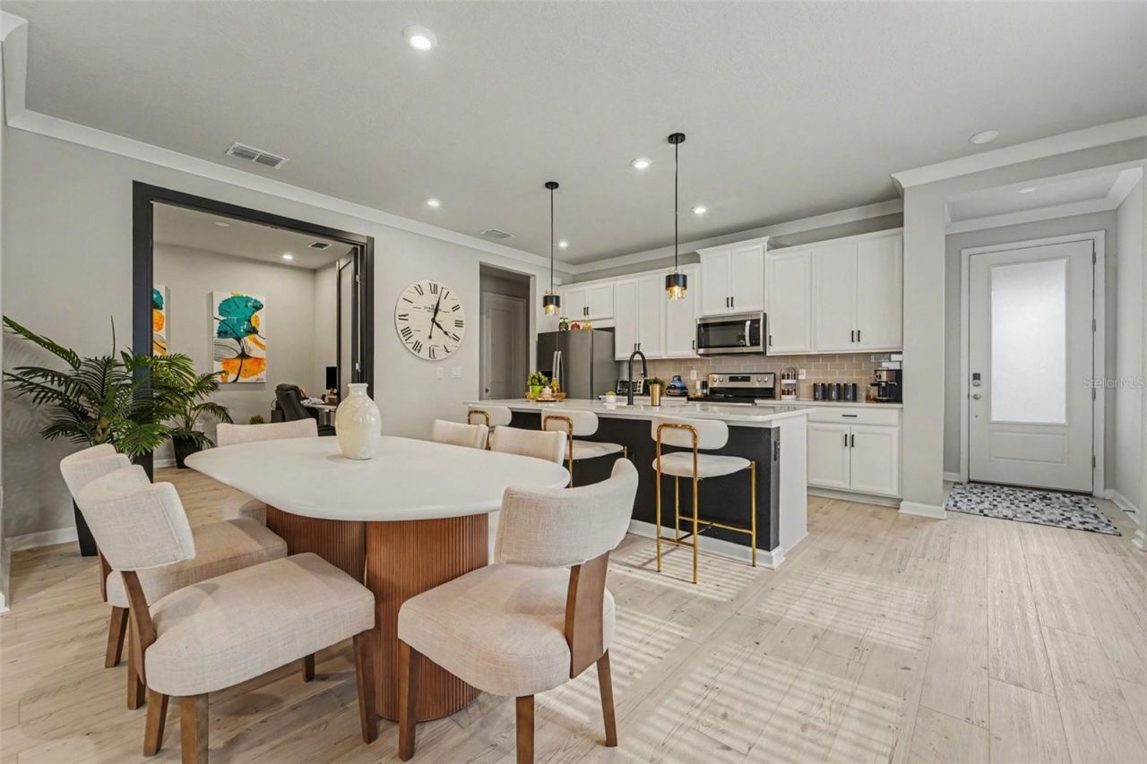 This exceptional Oceana paired villa showcases a collection of premium custom upgrades that elevate it far beyond the standard builder model, blending sophisticated design with modern luxury.The standout feature is the dedicated study, now enclosed by custom aluminum doors, creating a striking architectural focal point. This versatile space offers complete privacy for a home office or can easily be converted into a third bedroom.Throughout the home, all carpeting has been replaced with premium luxury vinyl plank (LVP) flooring, creating a seamless and elegant flow. Thoughtful enhancements such as crown molding, custom laundry room cabinetry, and bespoke storage near the secondary bedroom add both style and functionality.The owner's suite is a private retreat, featuring an exquisite tray ceiling that adds architectural interest, along with a spacious walk-in closet and a dual-sink vanity designed for comfort and convenience. A split floor plan further enhances privacy for guests.At the heart of the home, the gourmet kitchen impresses with Carrara Marmi quartz countertops, soft linen cabinetry, and an oversized island with breakfast seating-perfectly positioned to overlook the expansive Great Room, ideal for both everyday living and entertaining.Dramatic twelve-foot sliding glass doors open to a covered, screened-in paver lanai, offering a seamless indoor-outdoor living experience. Enjoy tranquil pond views and the rare privacy.Designed for effortless living, the HOA includes high-speed internet, professional lawn care, roof maintenance, and exterior painting. The home is also outfitted with a state-of-the-art smart home package, including an Ecobee thermostat and ClareOne touchscreen panel.Residents enjoy an elevated, resort-style lifestyle with exclusive access to a premier clubhouse featuring a lazy river and a fully equipped fitness center.